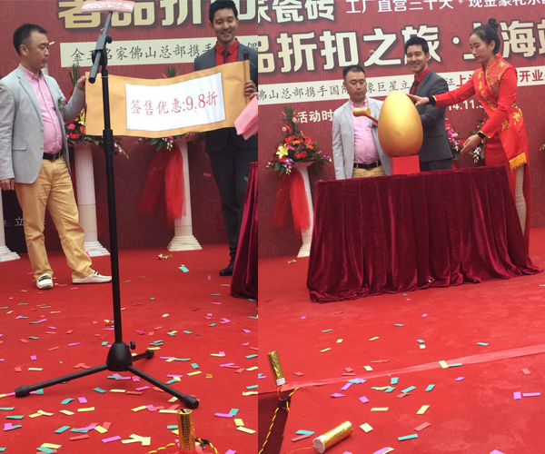 11月30日,嘉華明星經(jīng)紀公司攜國際偶像巨星立威廉見證上海旗艦店開業(yè)盛惠。當天下午金玉名家瓷磚奢品折扣之旅首站在上海正式拉開帷幕!,章氏企業(yè)董事長章云樹帶領參會嘉賓在金玉名家品牌營銷中心內(nèi),共同品鑒了代表著最新奢適生活理念的臻美精品。不少經(jīng)銷商表示,此次活動中展出的新品,不僅在原有的奢華基調(diào)上融入了時尚元素與藝術美感,而且金玉名家廠家在優(yōu)惠力度上做出了空前讓利,在終端市場吸引更多消費者的青睞。