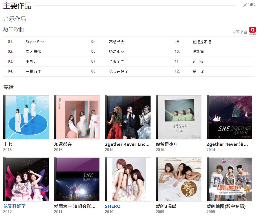 2000年共同參加《宇宙2000實力美少女爭霸戰(zhàn)》后受華研國際音樂相中并簽約。2001年9月11日發(fā)行首張專輯《女生宿舍》正式出道,憑借此專輯入圍第13屆臺灣金曲獎最佳新人獎 。2002年發(fā)行專輯《美麗新世界》并獲得第十四屆臺灣金曲獎獲得最佳重唱組合獎。2003年發(fā)行專輯《Super Star》入圍在第十五屆臺灣金曲獎最佳重唱組合獎 。2004年發(fā)行專輯《奇幻旅程》入圍第十六屆臺灣金曲獎最佳重唱組合獎 ,同年舉行首場世界巡回演唱會。2005年發(fā)行專輯《不想長大》入圍第十七屆臺灣金曲獎入圍最佳重唱組合獎 [8] 。2006年舉辦《S.H.E移動城堡世界巡回演唱會》。2007年發(fā)行專輯《Play》,憑借專輯主打曲《中國話》首次登上央視春晚表演。2008年發(fā)行專輯《我的電臺FMS.H.E》。2009年舉辦《S.H.E愛而為一世界巡回演唱會》;2010年發(fā)行專輯《SHERO》并宣布單飛不解散。2012年發(fā)行專輯《花又開好了》。2013年受中央電視臺春節(jié)聯(lián)歡晚會邀請并獻(xiàn)唱歌曲《SHERO》,3月舉辦巡回演唱會《2GETHER 4EVER 世界巡回演唱會》。2014年舉行《2GETHER 4EVER世界巡回演唱會安可場》 。2015年為內(nèi)地電影《少年班》獻(xiàn)唱主題曲《你曾是少年》。2016年8月推出EP《永遠(yuǎn)都在》。