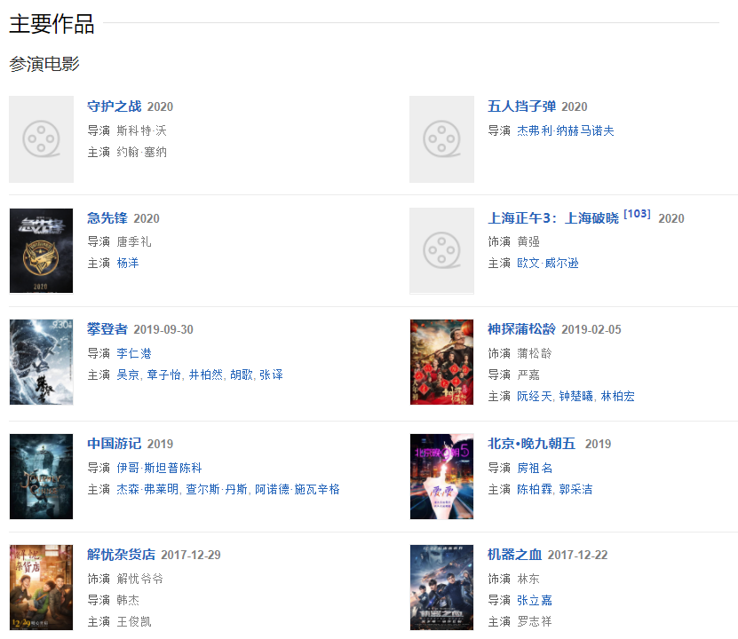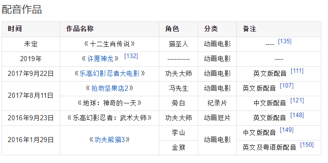 職業(yè):導演 | 編劇 | 演員 | 制作人 | 原創(chuàng)音樂 | 攝影 | 剪輯 | 選角導演 | 藝術(shù)指導 | 美術(shù)設(shè)計 | 布景師 | 服裝設(shè)計 | 視覺特效 | 動作導演 | 燈光師 | 歌手 | 武術(shù)指導 | 出品人 | 客串演員 | 監(jiān)制| 慈善家